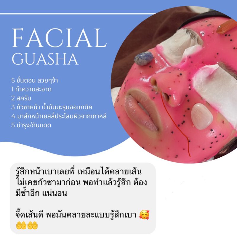 - การกัวซาหน้า เป็นการเกลี่ยเส้นกล้ามเนื้อ ที่มีความตึง แข็งเกร็ง ทำให้กล้ามเนื้อผ่อนคลาย ลดริ้วรอยแห่งวัย ถุงใต้ตา หางตา ร่องแก้ม ได้ดีมาก